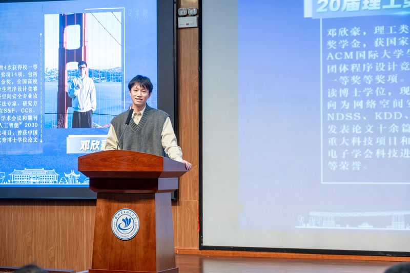 在对话校友、共促成长环节,2020届毕业生邓欣豪分享了从杭电本科到清华博士的成长经历,他特别强调“以目标为导向”的重要性,提醒学弟学妹们既要尽早确立目标,也要敏锐把握社会发展趋势,灵活调整前进方向。2023届毕业生王子怡分享通过竞赛锻炼、学生工作和实习实践,不断拓展视野、提升能力,走出了一条不断突破自我、持续发展的成长之路。
